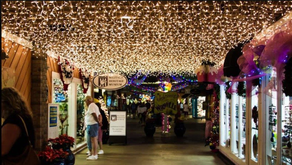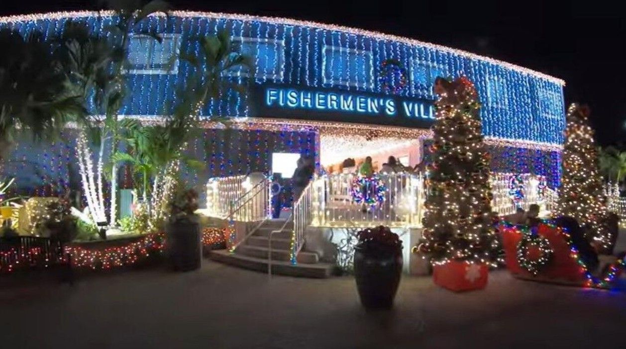 Visitors stroll beneath the holiday canopy inside Fishermen’s Village, where The Islands and several other locally operated restaurants are preparing to open.